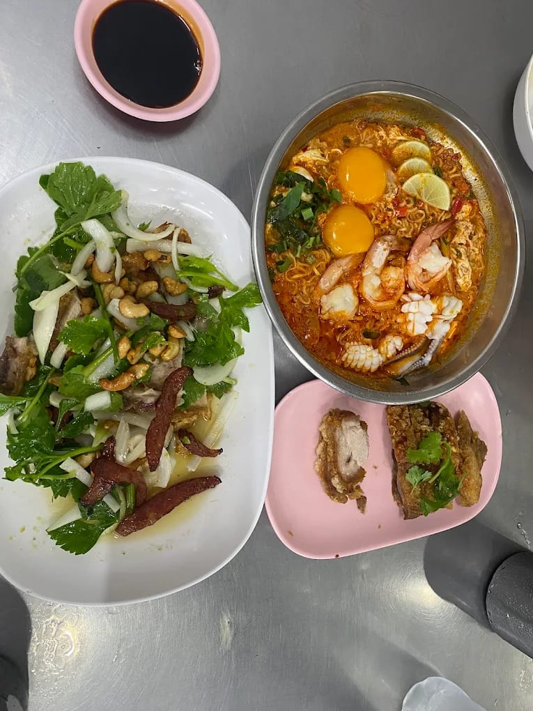 One of Bangkok's most famous late-night noodle spot and a Michelin Bib Gourmand holder for good reason. The signature dish is the Tom Yum Mama Noodles: a massive pot of creamy, spicy tom yum broth loaded with crispy pork, seafood, handmade meatballs, and raw egg yolks, all served over instant Mama noodles. It sounds simple. It's not. The broth is addictive and the portion feeds 2-3 people easily. They also do an excellent Thai-style salmon sashimi salad with a spicy lime and garlic dressing that regulars swear by. The place has been open for about 40 years but blew up on social media thanks to that photogenic noodle pot. It's chaotic, loud, not fully air-conditioned, and always packed. 4.2 stars on Tripadvisor with 134 reviews. Opens 4:30 PM, runs until midnight daily.