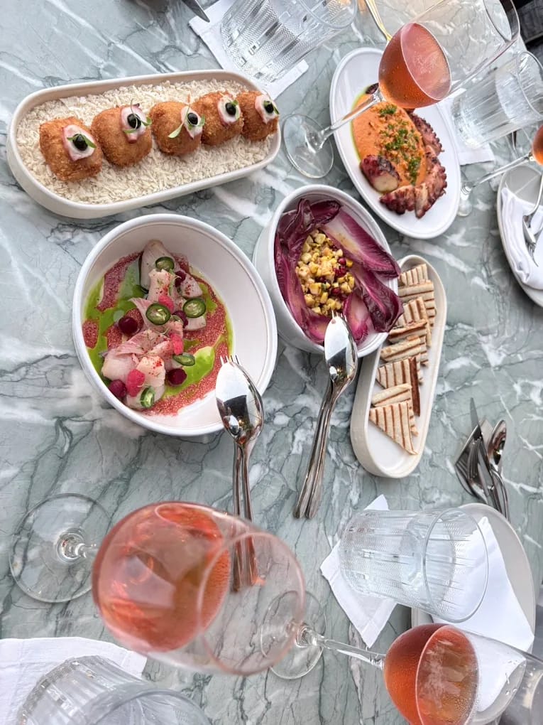 The space is designed around a central "Piazza" with blue-gradient curtains that echo ocean waves, an open kitchen, two private dining rooms, and a "Gourmet Library" showcasing the day's seafood. The main bar celebrates the Aperitivo tradition: pull up a stool and order the ruby whisper (whisky and limoncello, which sounds wrong and tastes perfect) or a paloma d'oro. Sharing plates are the way to go, from tuna loin to grilled seafood, and the desserts are shockingly good (the pistachio mille-feuille and apple crumble with vanilla ice cream are early standouts). The open-air terrace wraps toward Lumphini Park with sweeping green views and Bangkok's skyline rising behind. As the sun drops, a DJ takes over and the mood flips from golden-hour calm to proper party energy. There's also a hidden speakeasy tucked behind closed doors for anyone in the mood to hunt. With a 4.8 on Google with 85 reivews.